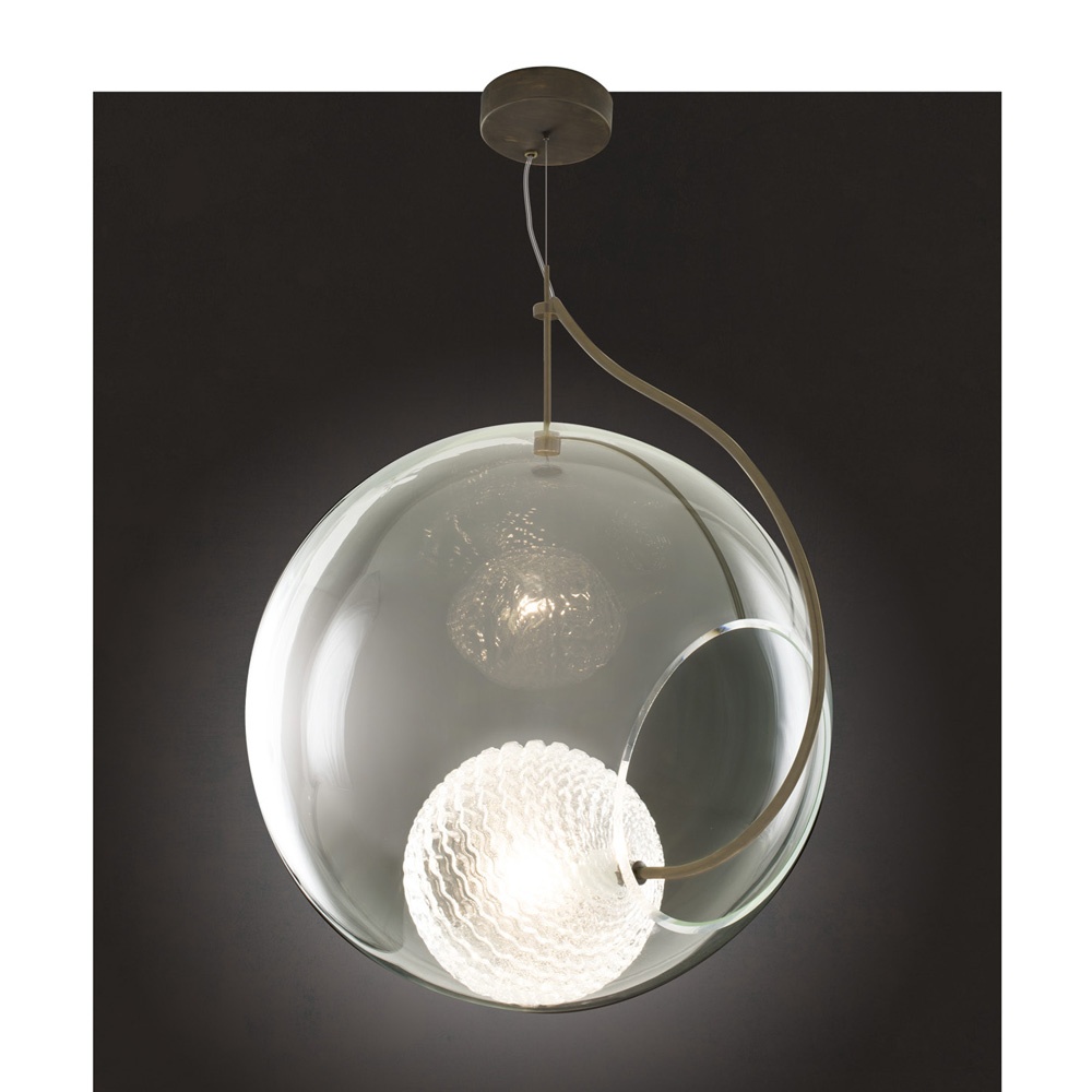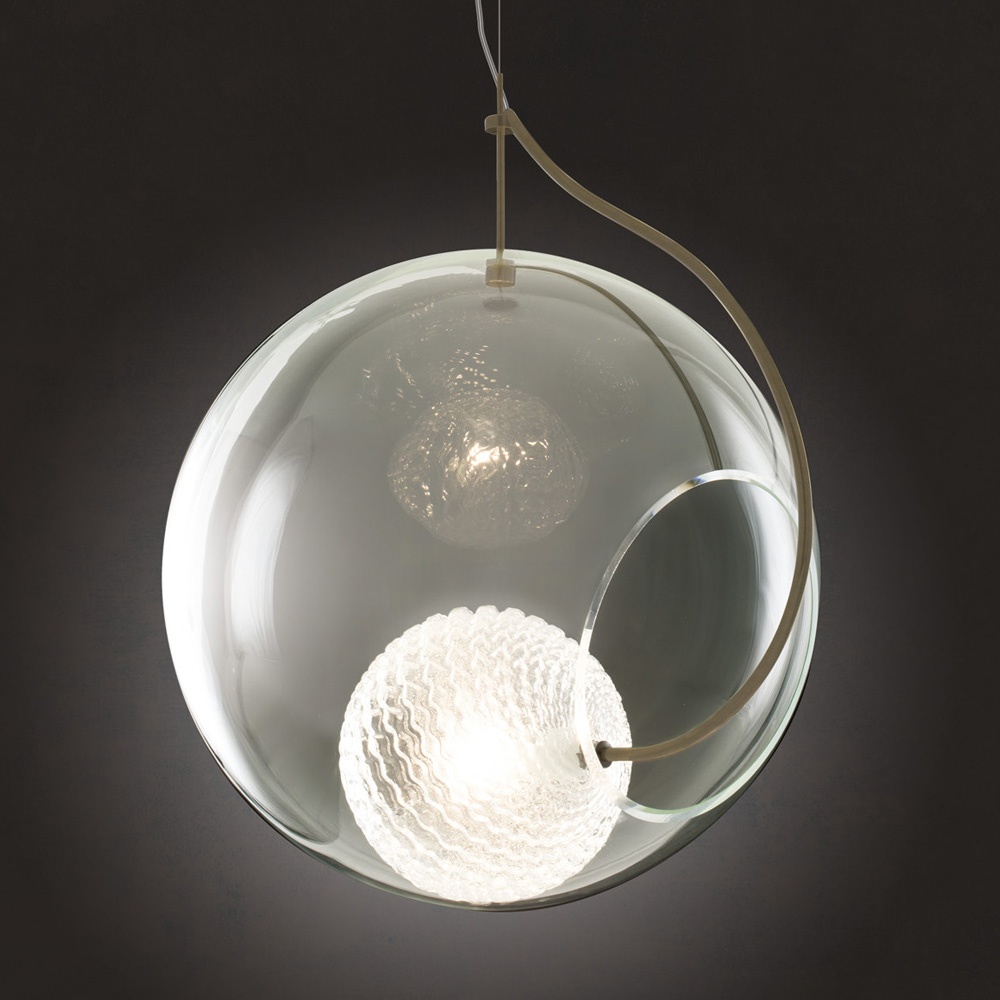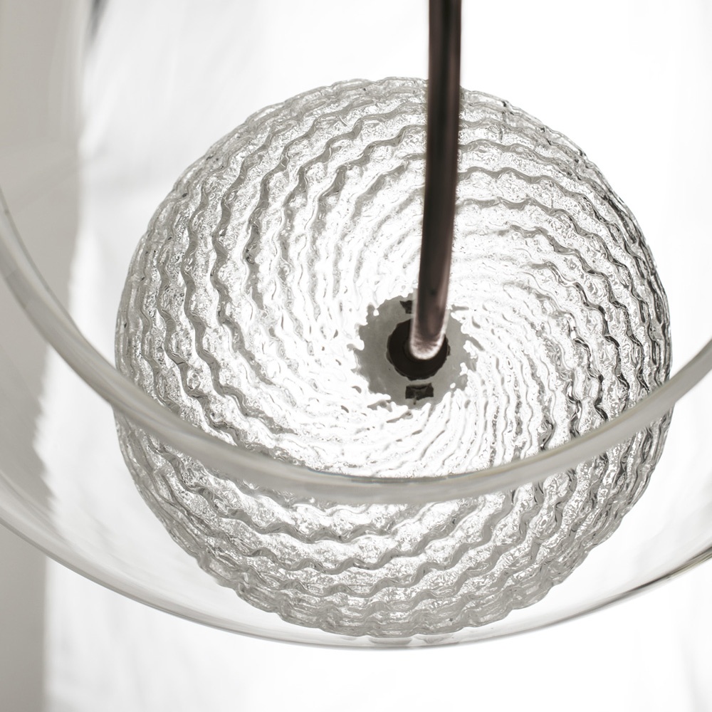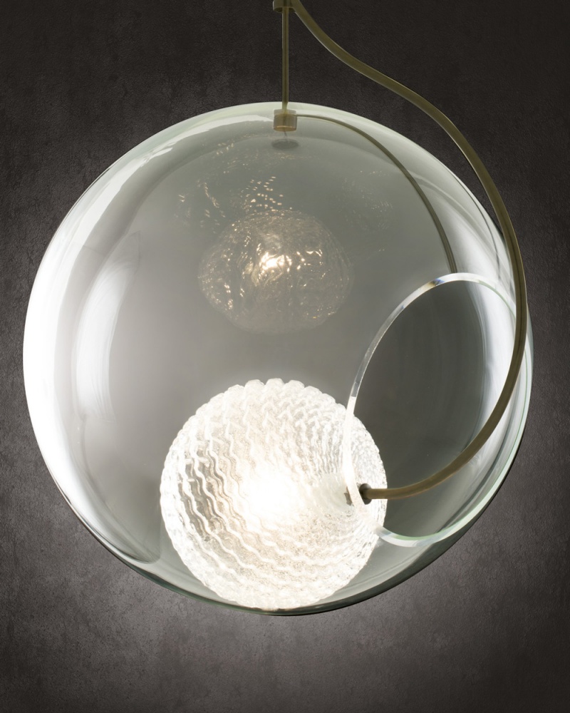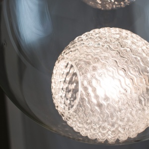 Pôvabná jednoduchosť kompozície dvoch gúľ nesie v sebe silný odkaz. Vnútorná guľa svojim zvlneným povrchom poukazuje na žeravý a tekutý pôvod skleneného materiálu. Vonkajšia guľa predstavuje náprotivok tej vnútornej. V čírej forme zachytáva vlastnosti vychladnutého skla - jeho priehľadnosť a pevnosť. Svietidlo poskytuje krásne priestorové svetlo s jemnou štruktúrou a svojou ľahkosťou rozsieva pôvab do všetkých smerov.